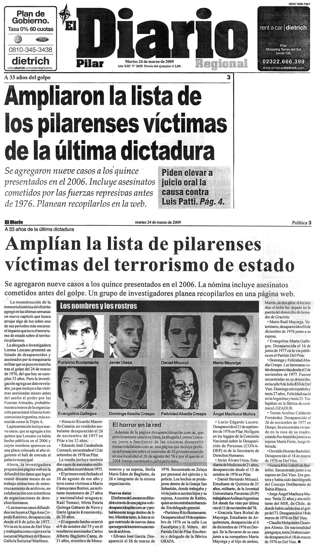 Volver a RecortesEl Diario, 24 de marzo 2009Amplían la lista de Pilarenses víctimas del terrorismo de estadoVolver a Recortes